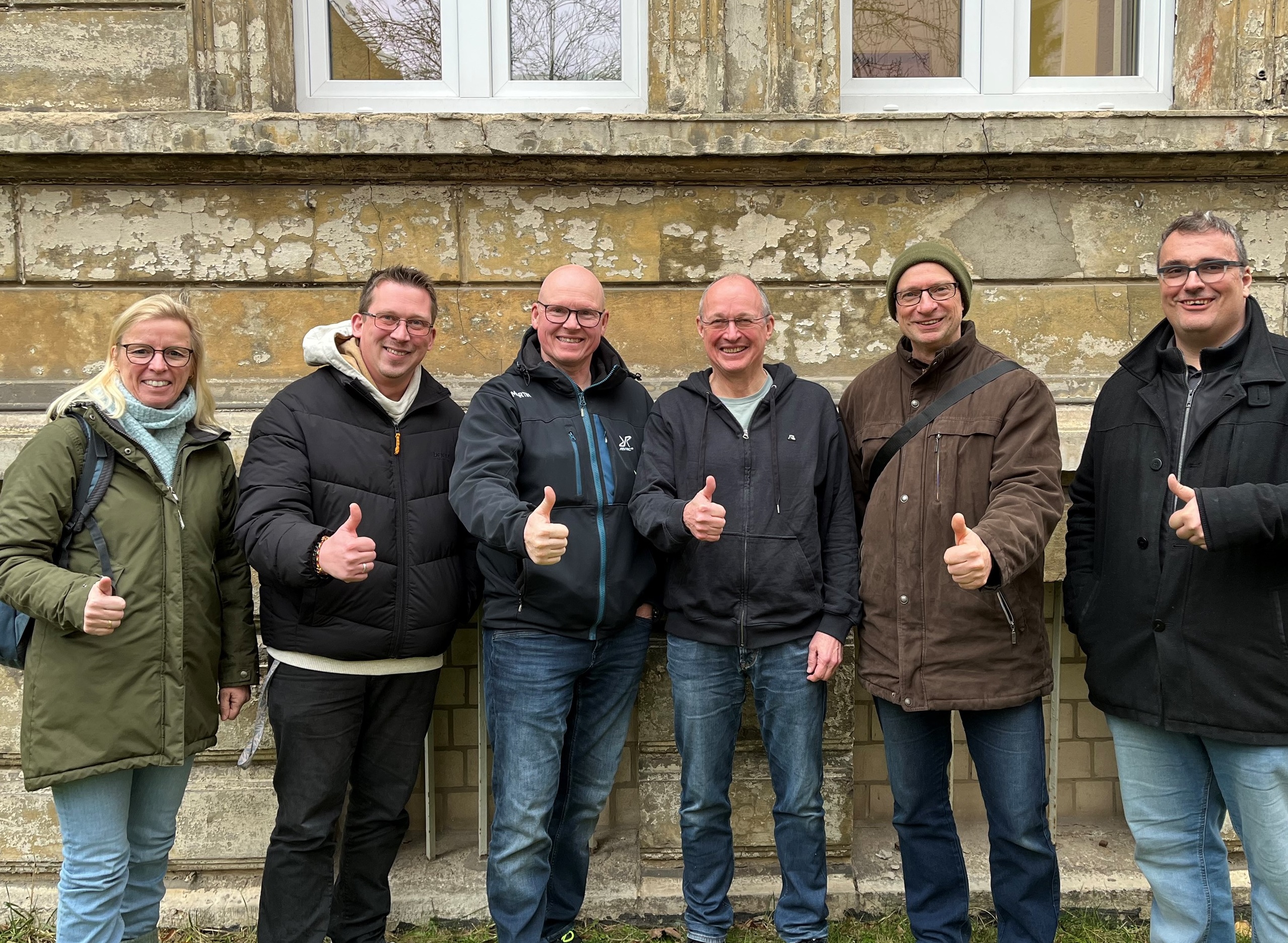 Fotounterschrift: Projektteam und Unterstützer bei der Abschlusspräsentation des Projektes (vlnr- Gundula van Haßelt Regionalverband (Fördermittelgeber), Fabian Degen (Wirtschaftsregion Helmstedt), Martin Silberborth (Harzer E-Bike), Prof. Vollrath (TU Braunschweig), Thomas Sturm (ERA), Daniel Tomowski (WiReGo).